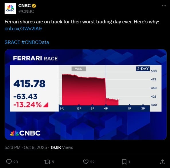 Ferrari ma za sobą najgorszy dzień na giełdzie w historii