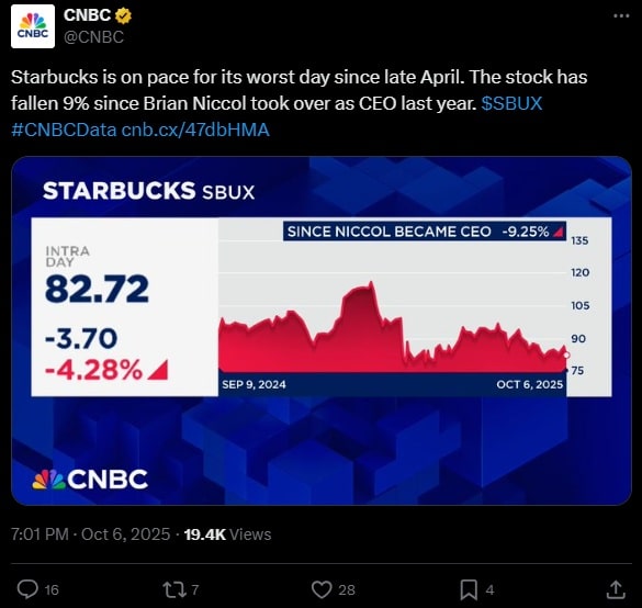 Niepokojąco wygląda również wskaźnik YTD (Yeard To Date), który pokazuje, jak podmiot radził sobie na giełdzie w trakcie roku. Od początku 2025 roku Starbucks stracił na wartości 10,31%.