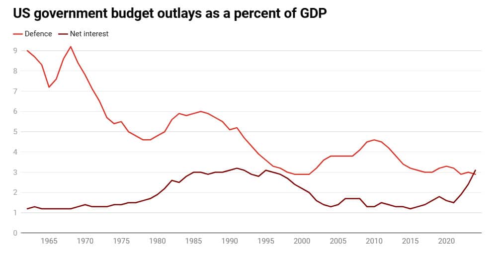 USA mają tę przewagę, że zadłużają się we własnej walucie i mogą – w teorii – refinansować swoje zobowiązania w nieskończoność. Problemem nie jest więc sam dług, ale koszt jego obsługi. A ten rośnie jak na drożdżach. Po serii podwyżek stóp procentowych w latach 2022–2023 rząd wydaje na odsetki około 882 miliardów dolarów rocznie. To więcej, niż budżet na obronę.