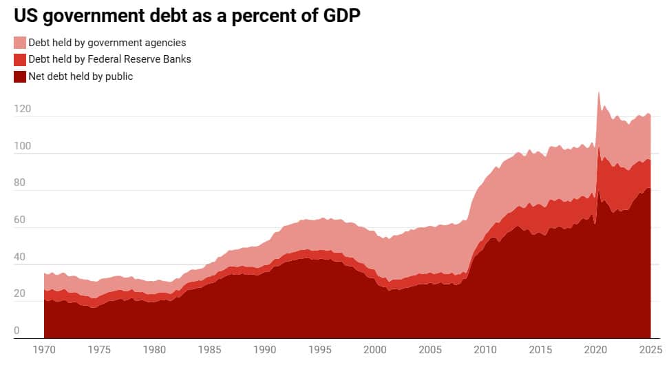 Kiedy mówi się o 37 bilionach, warto rozróżniać. Około 80% tego to tzw. dług publiczny… Czyli pieniądze pożyczone od inwestorów, firm, banków czy zagranicznych rządów. Reszta to zobowiązania wewnętrzne między instytucjami państwa, w tym wobec samej Rezerwy Federalnej.