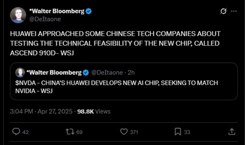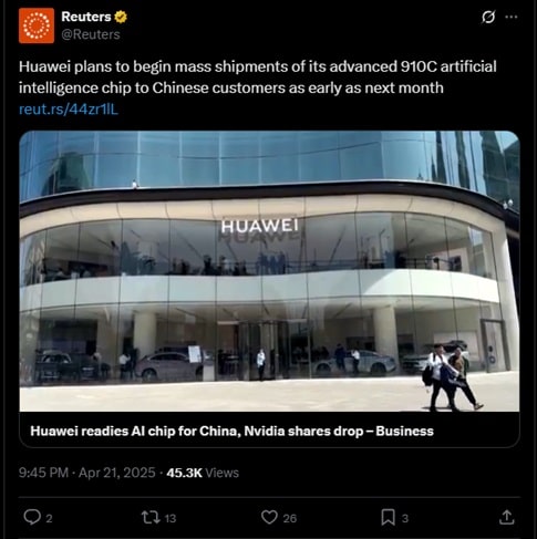 Nie wykluczone, że chipy AI od Huawei spowodują załamanie na rynkach podobne do tego, które wywołał pod koniec stycznia DeppSeek.