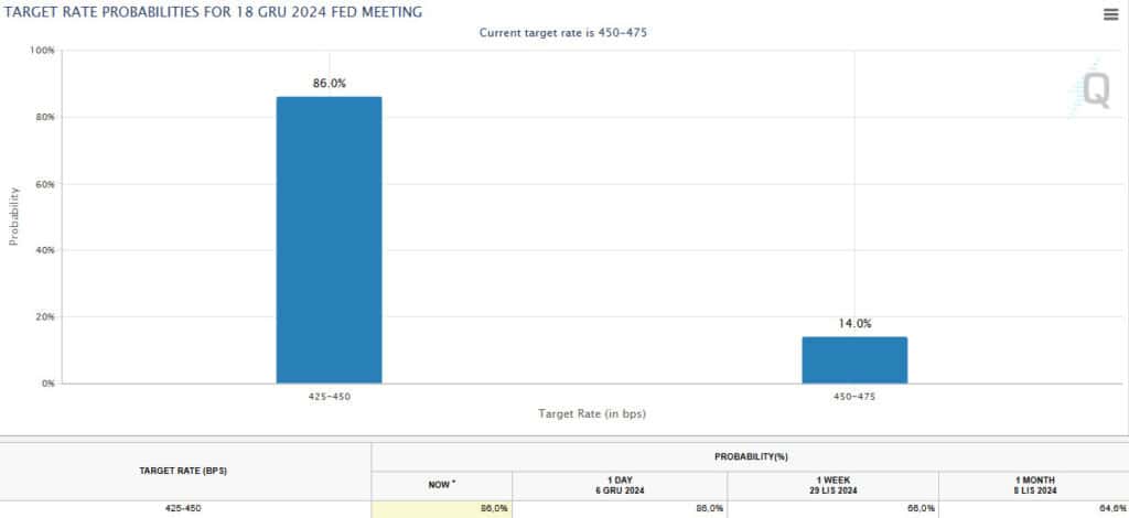 Ostatnie dane ISM z USA wypadały dość dobrze (przemysł powyżej prognoz, ale dość neutralnie, usługi nieco słabiej, lecz nadal solidnie), ale każdy z odczytów sugeruje, że presja cenowa utrzyma się dłużej. Jednocześnie nastroje konsumentów pozostają pozytywne, a PKB w tym roku wzrosnąć może nawet o 3%, czyli prawdopodobnie powyżej stopy inflacji. Powell zrobi w grudniu rynkom przykrą niespodziankę? Oczekiwania Wall Street wskazują, że cięcie o 25 pb jest niemal przesądzone. Inwestorzy wyceniają je z 86% prawdopodobieństwem.