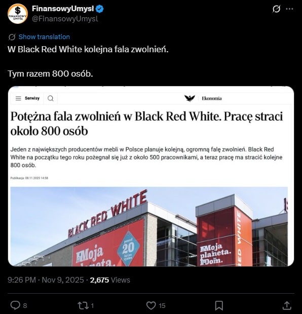 Sytuacja gospodarcza w Polsce zdaje się pogarszać z każdym kolejny miesiącem, choć politycy przekonują, że wszystko jest w porządku. Jednak chyba nie do końca tak jest, skoro dane Głównego Urzędu Statystycznego alarmują o masowych zwolnieniach, a największe polskie firmy z tradycjami ogłaszają upadłość. Kolejna firma, która jest liderem kluczowej branży dla polskiej gospodarki, ma kłopoty. Chodzi o meblowego giganta Black Red White, który do końca roku planuje zwolnić blisko 1000 osób.