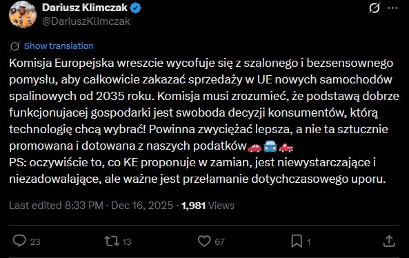 Wygląda na to, że opór społeczny w połączeniu z kryzysem europejskiej branży motoryzacyjnej wreszcie przekonały europejskich decydentów z Brukseli. Wczoraj Komisja Europejska oficjalnie wycofała się z szalonego pomysłu, który zakładał, że w Unii Europejskiej będzie można rejestrować auta spalinowe tylko do 2035 roku. To dla wielu kierowców i producentów aut dobra informacja. Jednak eurokraci mają nową propozycję.