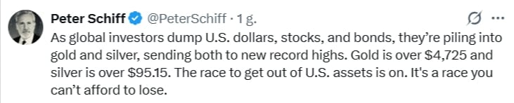 Na platformie X znani obserwatorzy rynku, tacy jak Peter Schiff, wskazują, że przy cenie złota wynoszącej ponad 4725 USD rynek zaczyna wyceniać realną utratę zaufania do tradycyjnego pieniądza papierowego.