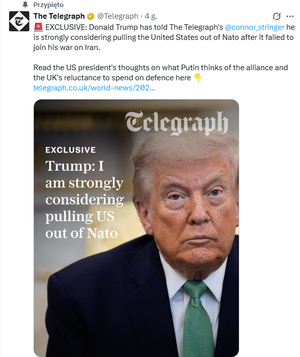 Amerykański prezydent w wywiadzie dla brytyjskiego dziennika „Telegraph” określił sojusz mianem „papierowego tygrysa” i stwierdził, że opuszczenie paktu obronnego jest obecnie kwestią wykraczającą poza ramy ponownego rozważenia. Trump podkreślił, że nigdy nie ulegał wpływom NATO i od dawna kwestionował wiarygodność tej organizacji, co jego zdaniem doskonale rozumie również Władimir Putin.