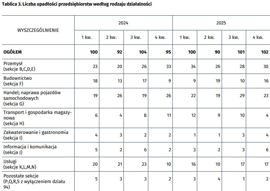 W tym tygodniu pojawiły się dane na temat upadłość w sektorze przedsiębiorstw za ostatni kwartał 2025 roku. Z danych Głównego Urzędu Statystycznego wynika, że w czwartym kwartale ubiegłego roku wniosek o upadłość złożyły 102 podmioty. To siedem przypadków więcej niż w tym samym okresie w 2024 roku. Najwięcej zgłoszeń wpłynęło z takich branż jak budowlanka i usługi, gdzie wpłynęło siedem więcej wniosków o upadłość. W branży informacji i komunikacji był cztery wniosków o bankructwo więcej. W sektorze gastronomii i hotelarstwa przypadków upadłości było więcej o dwa.