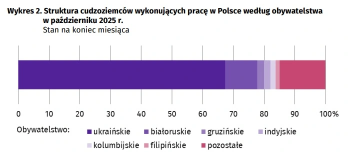 Według stanu na 31 października 2025 r. było ich 767,1 tys., czyli o 7,3%, niż w analogicznym okresie rok wcześniej. Obywatele z tego państwa stanowią aż 67,3% ogólnej liczby cudzoziemców, którzy pracują w Polsce. Najwięcej pracujących cudzoziemców przebywa w regionie warszawskim stołecznym (20,2%).