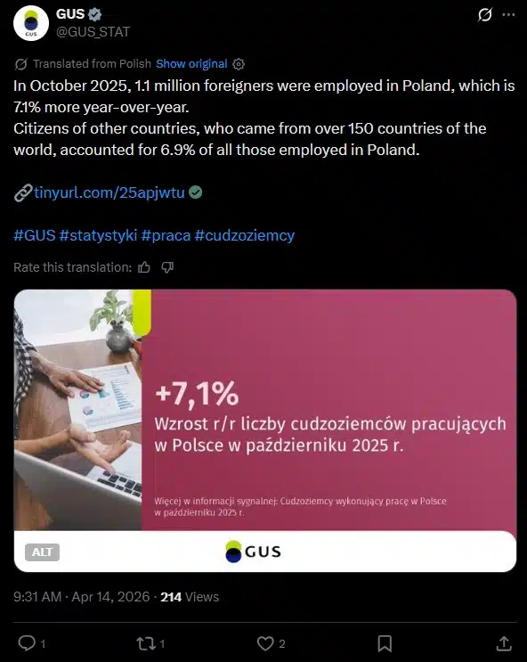 Z najnowszego raportu GUS „Cudzoziemcy wykonujący pracę w Polsce w październiku 2025 r.” wynika, że na koniec października 2025 r. w Polsce pracowało 1139,4 tys. cudzoziemców. W porównaniu z październikiem 2024 roku to wzrost aż o 7,1%. W porównaniu do poprzedniego miesiąca ich liczba zwiększyła się o 0,9%. Ponadto w grupie pracujących cudzoziemców 59,9% stanowili mężczyźni. Na dzień 31 października 2025 r., 441,3 tys. osób realizowało wyłącznie umowy zlecenia i pokrewne. Było to o 6,3% więcej niż w październiku 2024 r. oraz 0,9% więcej niż miesiąc wcześniej.