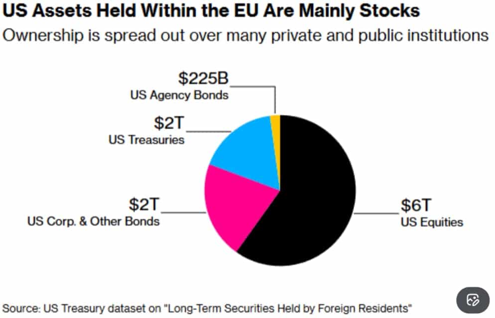 Wraz z narastaniem napięć wokół Grenlandii i gróźb handlowych ze strony Donalda Trumpa, w Europie coraz częściej pojawia się temat teoretycznego „uzbrojenia” ogromnych europejskich aktywów ulokowanych w Stanach Zjednoczonych. Chodzi o około 10 bln dolarów w amerykańskich obligacjach i akcjach; w akcjach spółek spoczywa około 6 bln USD.Te w skrajnym scenariuszu mogłyby zostać użyte jako forma presji na USA. Problem polega na tym, że ta broń jest niezwykle trudna do skutecznego użycia.