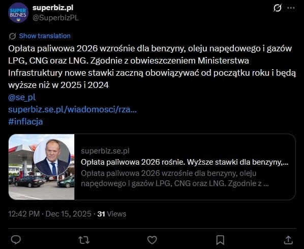 Ministerstwo Infrastruktury opublikowało w Monitorze Polskim obwieszczenie w sprawie podwyżki opłaty paliwowej w 2026 roku. Będzie to już trzecia podwyżka tej daniny. Opłata paliwowa wzrośnie do 4%, co oznacza, że nowa stawka za 1000 l benzyny wzrośnie do 210,29 zł. Podwyżka dotyczy benzyn silnikowych oraz wyrobów powstałych ze zmieszania tych benzyn z biokoponentami. Przed podwyżką stawka wynosiła 202,20 zł