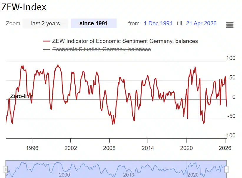 Indeks ZEW nie mierzy bieżącej produkcji czy PKB, lecz oczekiwania inwestorów i analityków co do przyszłości gospodarki. W praktyce działa więc jako wskaźnik wyprzedzający – często sygnalizuje zmianę trendu, zanim pojawi się ona w twardych danych makroekonomicznych. Obecny spadek do -17,2 pkt oznacza, że pesymizm zaczyna dominować wśród uczestników rynku finansowego.