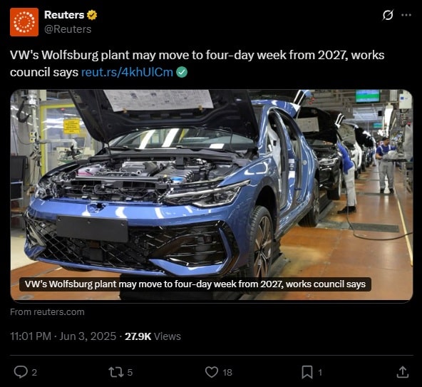 Cavallo argumentuje, że „Musimy teraz podjąć działania, abyśmy mogli z nich skorzystać później… Od 2027 r. tymczasowy czterodniowy tydzień pracy nie jest nierozsądnym scenariuszem„. Ponadto koncern poważnie rozważa przeniesienie części produkcji silników spalinowych do fabryk w Meksyku.