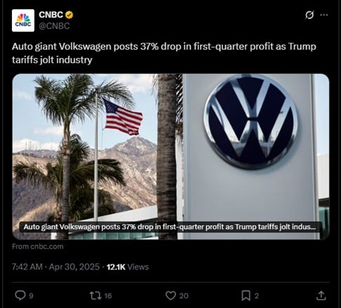 Bez wątpienia polityka celna, którą wdraża Donald Trump, jest szczególnie bolesna dla branży motoryzacyjnej. Arno Antlitz, dyrektor finansowy i dyrektor operacyjny Grupy Volkswagen, powiedział, że „Zgodnie z oczekiwaniami, Grupa Volkswagen miała mieszany początek roku obrotowego”. Wśród przyczyn niepewności Antiltz wskazał „obecną niestabilną sytuację gospodarczą na świecie”.