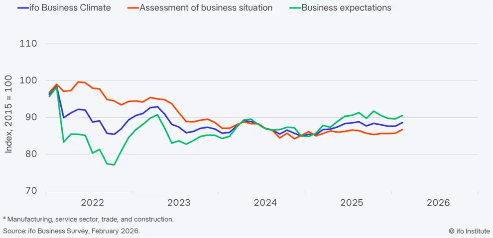 Wskaźnik klimatu biznesowego wzrósł w lutym do poziomu 88,6 punktu, co stanowi wyraźny skok w porównaniu do 87,6 punktu odnotowanych w styczniu. Przedsiębiorcy za naszą zachodnią granicą wykazują obecnie znacznie większą satysfakcję z bieżącej sytuacji rynkowej, a ich oczekiwania co do nadchodzących miesięcy uległy zauważalnej poprawie.