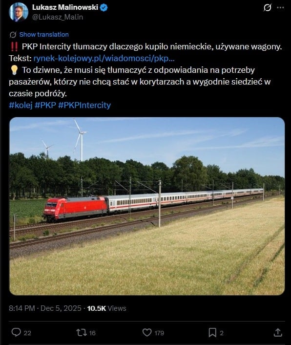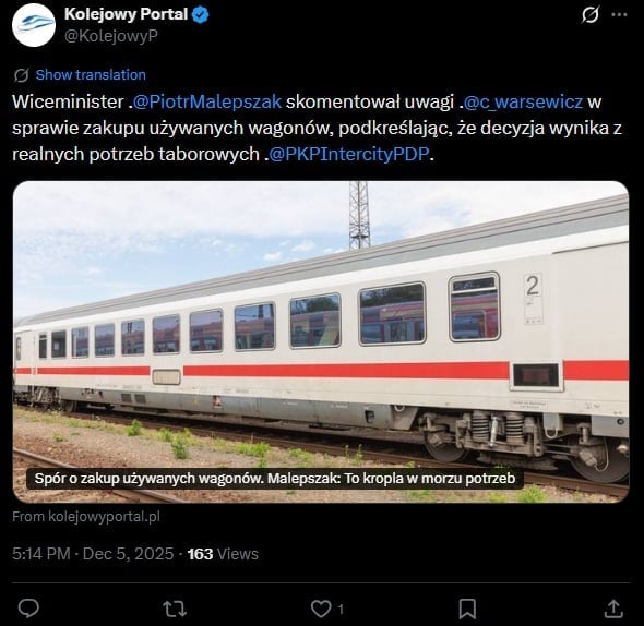 Na platformie X były prezes spółki napisał: „PKP Intercity znów kupuje używane wagony, choć w Polsce wciąż czekają na modernizację setki własnych pojazdów. Od dwóch lat słyszymy krytykę poprzedników, ale realnych działań obecnego zarządu brak. Tak nie wygląda profesjonalne, długofalowe zarządzanie taborem„.