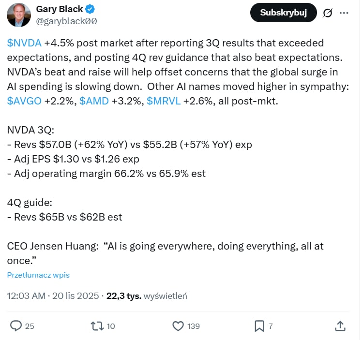 W mediach społecznościowych, a zwłaszcza na X, dyskusja o dominacji Nvidii jest bardzo gorąca. Analityk finansowy, Gary Black, komentując wyniki Nvidii, zwrócił uwagę na niespotykaną skalę inwestycji infrastrukturalnych. Black podkreślił, że chociaż wyniki są imponujące, to kluczowe jest, jak szybko te inwestycje przełożą się na realne, trwałe zyski dla głównych klientów Nvidii, a nie tylko na sam wzrost sprzedaży chipów.