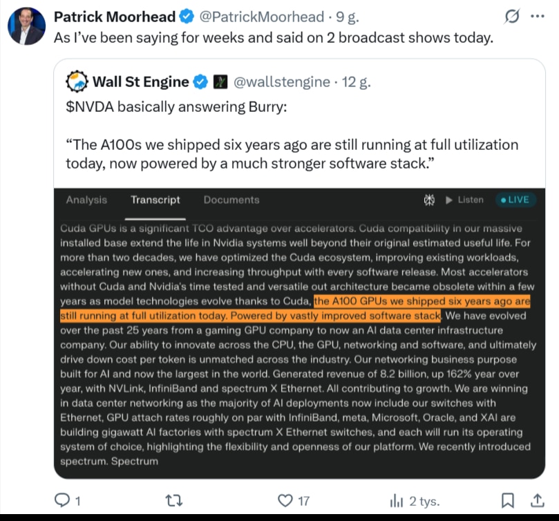 Analityk technologiczny Patrick Moorhead, znany ze swoich wnikliwych komentarzy na temat rynku półprzewodników, w jednym ze swoich wpisów zasugerował, że choć Nvidia ma dziś miażdżącą przewagę, rosnąca konkurencja ze strony wewnętrznie projektowanych chipów (ASIC) przez Google i Amazon, a także ich sprzedaż innym podmiotom, stanowi długoterminowe zagrożenie.