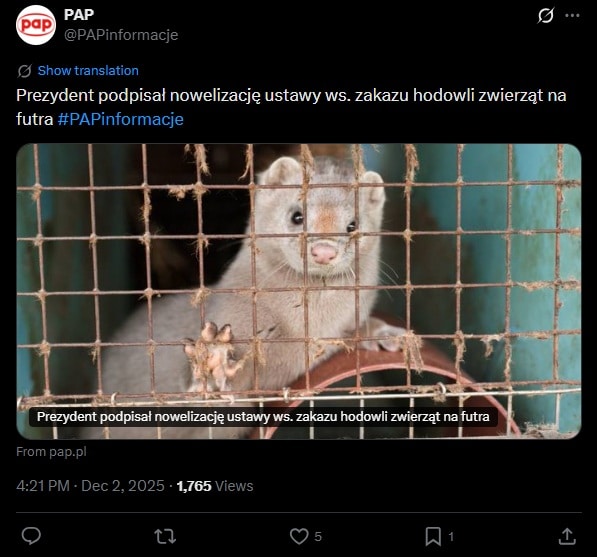 Prezydent Karol Nawrocki swoją decyzję uzasadnił badaniami na ten temat. Ostatnie sondaże wykazały, że około dwie trzecie obywateli sprzeciwia się dalszej działalności ferm zwierząt futerkowych.