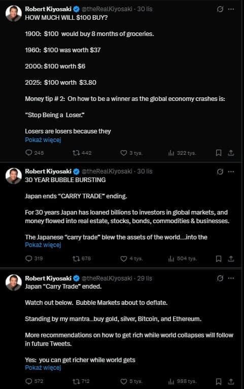 Gospodarka globalna zanurkuje, a rynki finansowe czeka katastrofa? Tak twierdzi Robert Kiyosaki, autor kultowego 'Bogaty ojciec, biedny ojciec’. Tym razem ostrzegł przed rzekomym końcem japońskiego carry trade i globalnym pęknięciem bańki aktywów. To typowy dla niego miks strachu i osobistych rekomendacji inwestycyjnych. Te od lat budzą kontrowersje na całym świecie. Inspiracją do poniższego tekstu są ostatnie tweety Kiyosakiego, na platformie X.