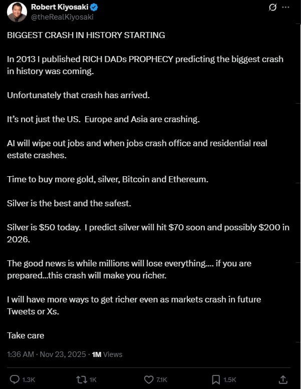 Wygląda jednak na to, że Robert Kiyosaki ma już nowego faworyta. W kolejnej wiadomość na X biznesmen wyraźnie zachęca do kupowania srebra. Jak napisał w poście z 23 listopada „Srebro jest najlepsze i najbezpieczniejsze”. Kiyosaki prognozuje, że niebawem srebro osiągnie 70 USD, a do 2026 roku nawet 200 USD. Tylko czy ktoś mu jeszcze uwierzy?