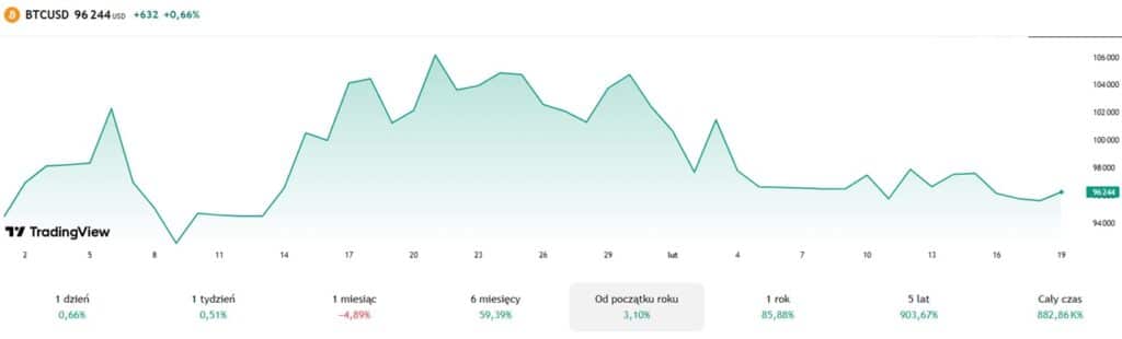W chwili pisania tekstu Bitcoin od początku roku zyskuje 3,10%. Z kolei przez cały 2024 rok największa kryptowaluta zwiększyła swoją wartość o 85,88%.