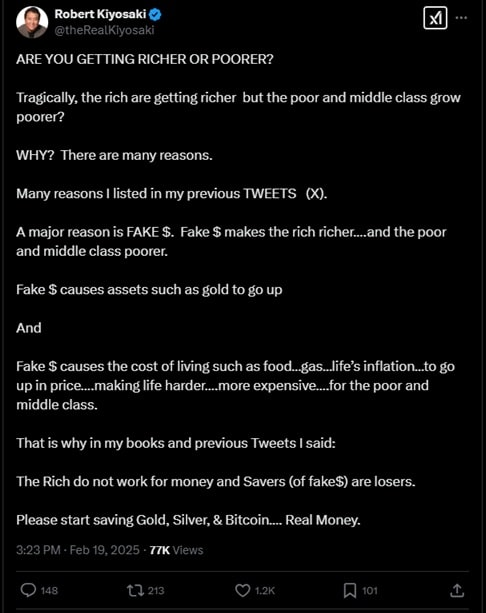 W swoim najnowszym wpisie na X Robert Kiyosaki ponownie wrócił do tego tematu. Swoją wiadomość rozpoczął od przedstawienia tego, w jaki sposób wygląda obecnie społeczeństwo. Jak przekonuje biznesmen, obecny system jest wadliwy. Dlatego prowadzi do tego, że bogatsi stają się jeszcze bardziej zamożni. Natomiast klasa średnia i biedni tracą coraz bardziej.