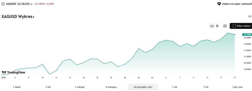 Jeśli chodzi o srebro, to sytuacja również wygląda całkiem nieźle. Tylko od początku roku srebro zyskało około 10%. Natomiast przez cały ostatni rok srebro zwiększyło swoją wartość o około 30%.