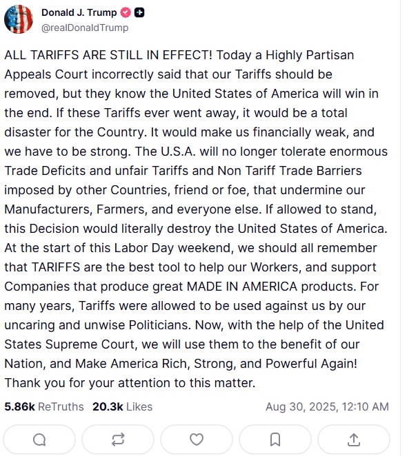 Decyzja, podjęta stosunkiem głosów 7-4, podważa jeden z kluczowych filarów polityki gospodarczej obecnej administracji Stanow Zjednoczonych . Choć taryfy pozostaną w mocy do 14 października, aby umożliwić rządowi złożenie apelacji do Sądu Najwyższego, orzeczenie to stanowi poważny cios dla prezydenta.