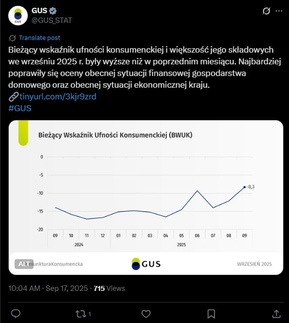 Chociaż rachunki wzrosły, a ceny w sklepach ciągle się nie zatrzymują, to okazuje się, że nastroje konsumenckie wśród Polaków się poprawiają. Najnowszy raport Głównego Urzędu Statystycznego ujawnia, że wskaźnik ufności konsumenckiej (BWUK), który opisuje obecne tendencje konsumpcji indywidualnej, wyniósł minus 8,3 i był o 3,8 p. proc. wyższy w stosunku do poprzedniego miesiąca. W odniesieniu do września 2024 roku to wyniki wyższy o 5,6 p. proc.
