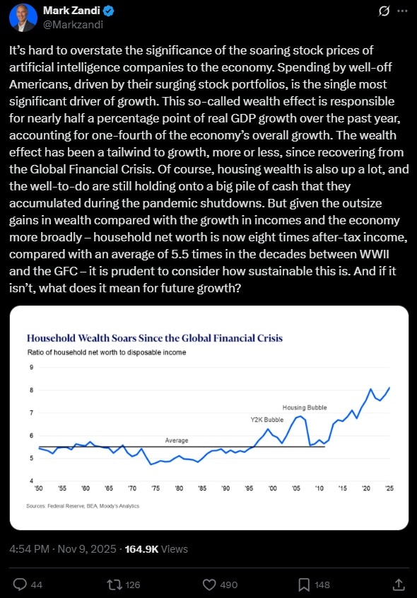 Zandi szacuje, że w ten efekt odpowiada za około 0,5% PKB w USA. Ekspert dodaje, że aktualnie majątek gospodarstw domowych wynosi obecnie około ośmiokrotności dochodu po opodatkowaniu. To znacznie więcej od historycznej średniej, która wynosi 5,5-krotność dochodu.