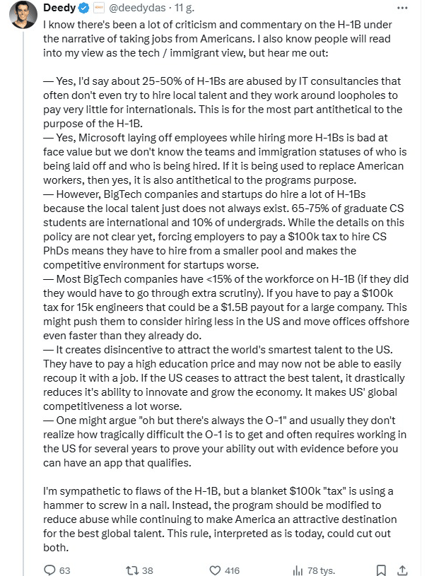Przeciwnicy programu H-1B od dawna twierdzą, że firmy wykorzystują go do obniżania płac i marginalizowania amerykańskich pracowników. Nowa opłata ma zapobiec takim praktykom. Według urzędników administracji Trumpa, posunięcie to ma przynieść do budżetu setki miliardów dolarów, co miałoby pomóc w obniżeniu podatków i zmniejszeniu długu publicznego. Krytycy obawiają się jednak, że ten krok może mieć odwrotny skutek, prowadząc do odpływu talentów do innych krajów, takich jak Kanada czy Wielka Brytania, które aktywnie zachęcają do migracji wykwalifikowanych pracowników. Według Pew Research Center, w 2024 roku ponad 60% posiadaczy wiz H-1B pracowało na stanowiskach związanych z informatyką, a ich średnie roczne zarobki wynosiły 123 600 dolarów. Eksperci zwracają uwagę, że radykalna zmiana polityki wizowej może zmusić amerykańskie firmy do przenoszenia działalności badawczo-rozwojowej za granicę, aby tam pozyskiwać potrzebnych im inżynierów i programistów. To z kolei mogłoby prowadzić do osłabienia pozycji USA jako globalnego lidera w dziedzinie technologii i innowacji.