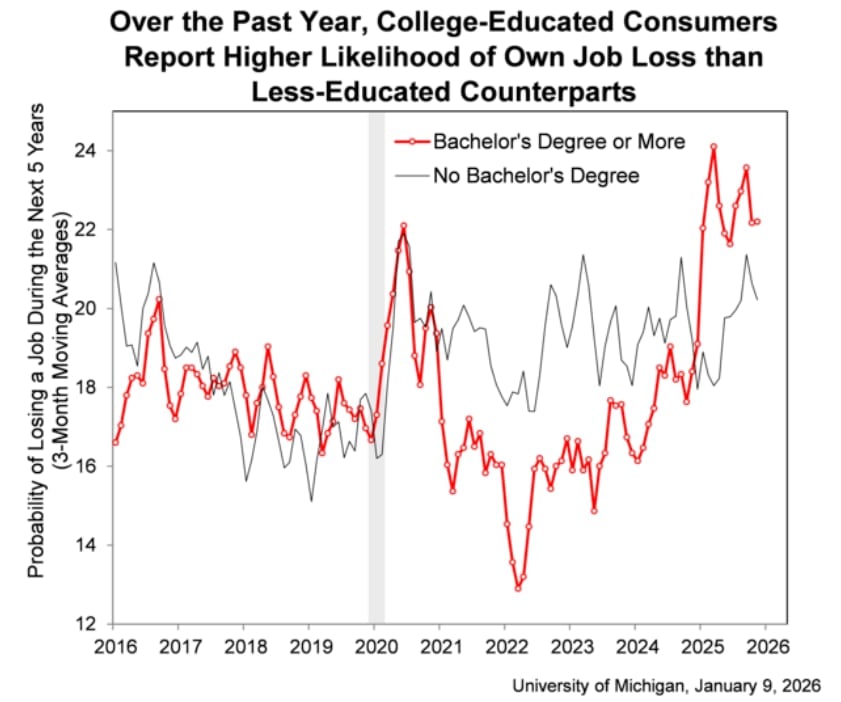 Choć obawy związane z polityką celną stopniowo maleją, konsumenci pozostają powściągliwi w ocenie ogólnej siły warunków prowadzenia działalności gospodarczej oraz perspektyw rynku pracy. Co bardzo interesujące, pracownicy wykwalifikowani przestraszyli się utraty pracy bardziej, niż robotnicy fizyczni. Wydaje się oczywiste, że wpływ na ten fakt ma rozwój sztucznej inteligencji.