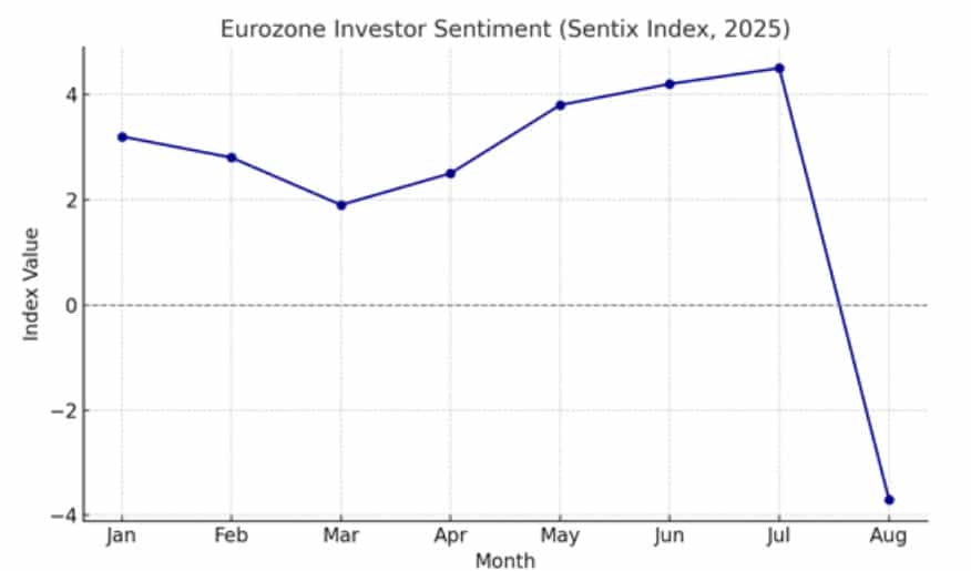 Nie tego się spodziewano. Zamiast ulgi po miesiącach napięć handlowych, najnowsza umowa taryfowa między Brukselą a Waszyngtonem przyniosła inwestorom… rozczarowanie i niepokój. W sierpniu indeks nastrojów Sentix w strefie euro runął z +4,5 do -3,7 punktu. To nie tylko nagły zwrot w oczekiwaniach, ale i niepokojący sygnał dla decydentów politycznych. Europa znów skręca w stronę niepewności. Trudno nie zauważyć, jak inwestorzy zaczynają wątpić w siłę europejskiej gospodarki i nie bez powodu.