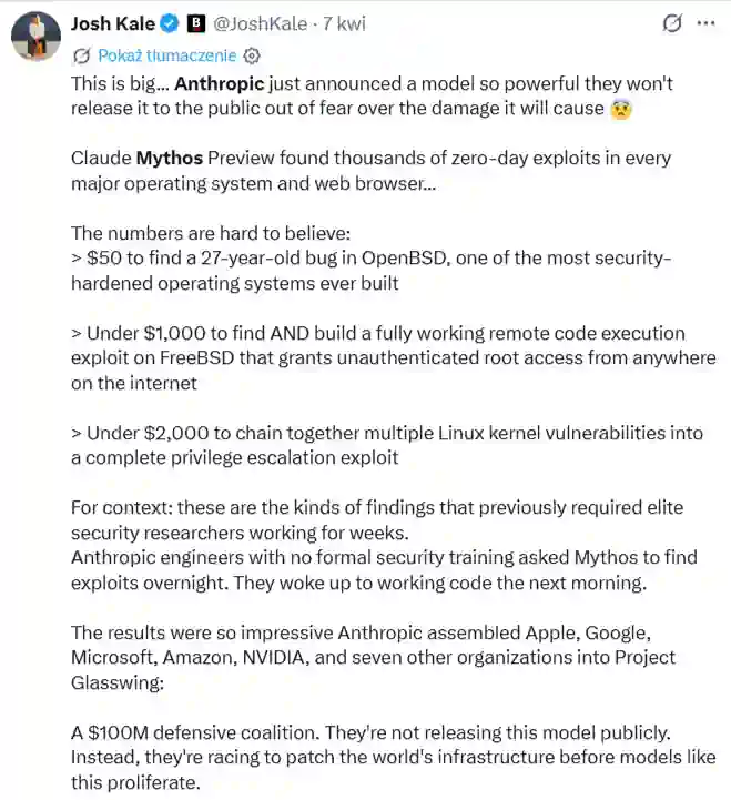 Przypomnijmy, że Anthropic wprowadził model Mythos na rynek w tym tygodniu, jednak zrezygnował z jego szerokiej dystrybucji ze względu na obawy o ujawnienie nieznanych dotąd luk w zabezpieczeniach. Firma oficjalnie przyznała, że ich nowe narzędzie potrafi identyfikować i wykorzystywać słabości w niemal każdym głównym systemie operacyjnym oraz przeglądarce internetowej. Eksperci zwracają uwagę, że model ten posiada bezprecedensowe zdolności ofensywne, co czyni go potencjalnie niebezpiecznym narzędziem w rękach cyberprzestępców.