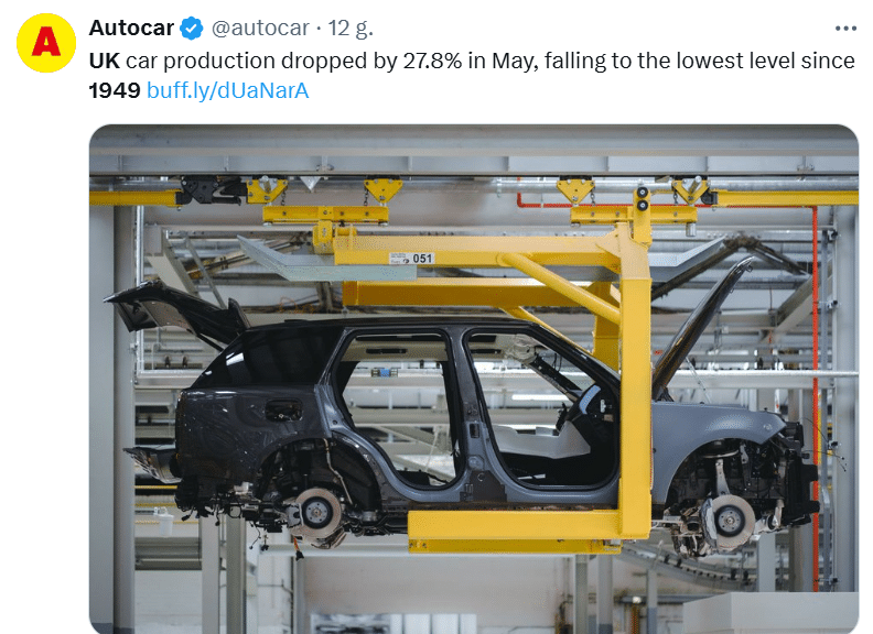 To nie był dobry miesiąc dla brytyjskiego przemysłu motoryzacyjnego. Właściwie, będąc skrupulatnym, to był najgorszy od… 1949 roku. Według Society of Motor Manufacturers and Traders, w maju z fabryk wyjechało tylko 49 810 aut. To spadek o niemal jedną trzecią w porównaniu z tym samym okresem w minionym roku. Jeśli wyłączymy anomalie, czyli pandemiczny lockdown z 2020 roku, to wynik ten rzeczywiście jest najniższy od 76 lat. Co lub kto za tym stoi? Jest jeden poważny podejrzany.