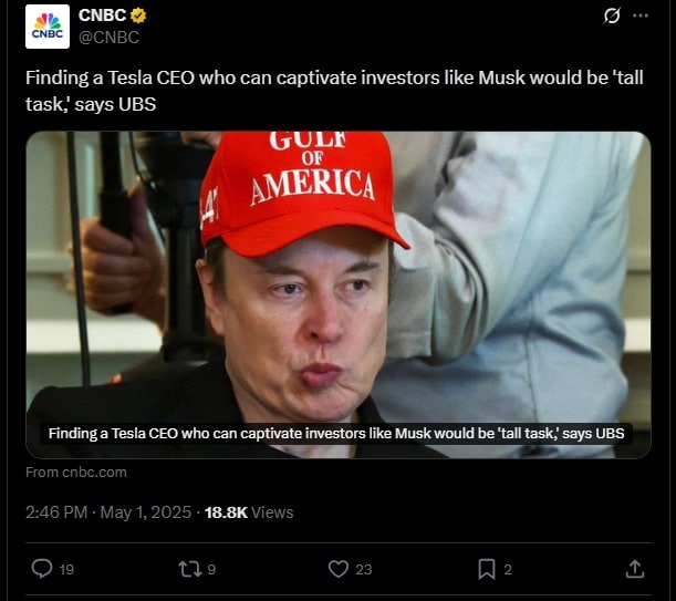 Miliarder dokończył jednak swoją misję i pozostał w departamencie przez pełne 130 dni, tak jak ustalił z Trumpem. W tym samym czasie The Wall Street Journal opublikował sensacyjną informację, jakoby zarząd Tesli miał rozważać szukanie następcy dla Muska. Portal podał, że Tesla rzekomo prowadzi rekrutację na stanowisko CEO, które piastuje ekscentryczny miliarder. Wokół tych doniesień szybko wybuchła wrzawa. Analitycy UBS ocenili, że znalezienie kogoś, kto będzie w stanie tak oczarować inwestorów, jak Elon Musk, będzie „wymagającym zadaniem”.