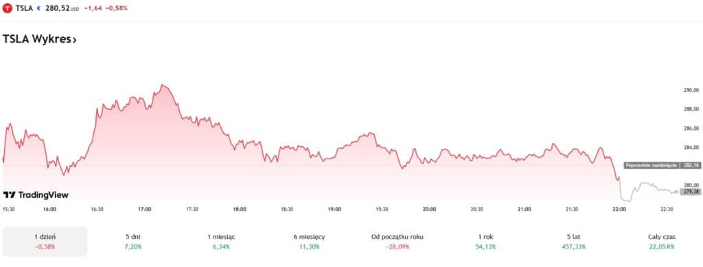 W ostatnich dniach Tesla odżyła nieco na giełdzie. W chwili pisania tekstu akcje giganta kosztują 280 dolarów za sztukę. Ponadto w ciągu ostatnich 24 godzin, w wyniku zawirowań, które wywołały opisane plotki, firma straciła na giełdzie 0,58%. Przez ostatni tydzień i miesiąc koncern zyskał odpowiednio 7,20% oraz 6,34%. Jednak słynny producent samochodów elektrycznych wciąż ma co odrabiać. Od początku roku Tesla straciła na giełdzie 28,09%.
