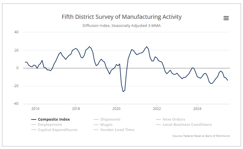 Richmond Fed Composite Index za lipiec 2025: -20, znacznie poniżej -2 oczekiwanych i -8 w czerwcu (zrewidowanych z -7)