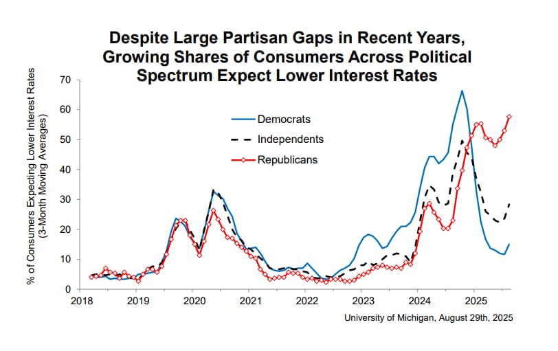 Co ciekawe, wzrost był zauważalny głównie wśród wyborców niezależnych i republikanów – demokraci pozostali przy lipcowych ocenach. To kolejny dowód, jak mocno polityka i gospodarka zaczęły się przenikać w amerykańskiej debacie publicznej. Długoterminowe oczekiwania inflacyjne również lekko się podniosły – z 3,4% do 3,5%. Właściwie to kończy krótki okres uspokojenia z poprzednich miesięcy.