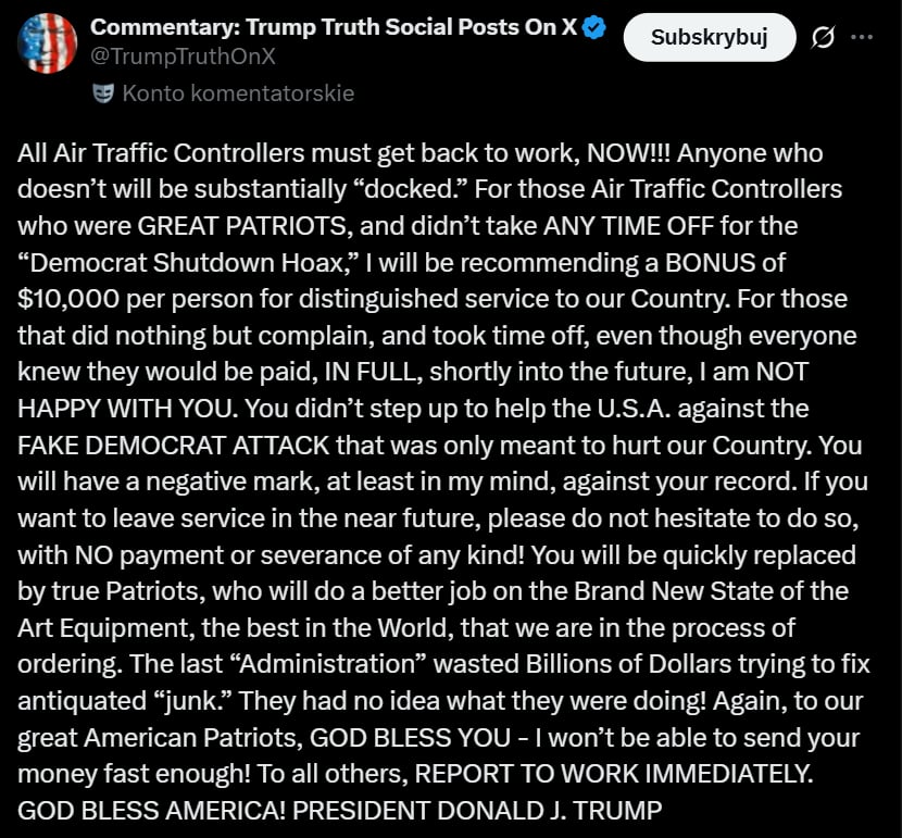 Czy „dywidenda z ceł” stanie się faktem? Trudno powiedzieć, choć wiele na to wskazuje. Trump znowu narzucił ton dyskusji gospodarczej w Ameryce. Jak zwykle zrobił to jednym postem w mediach społecznościowych. Postanowił też zaadresować kontrolerów lotów, grożąc pogorszeniem warunków pracy tym, którzy opuścili amerykańskie lotniska.