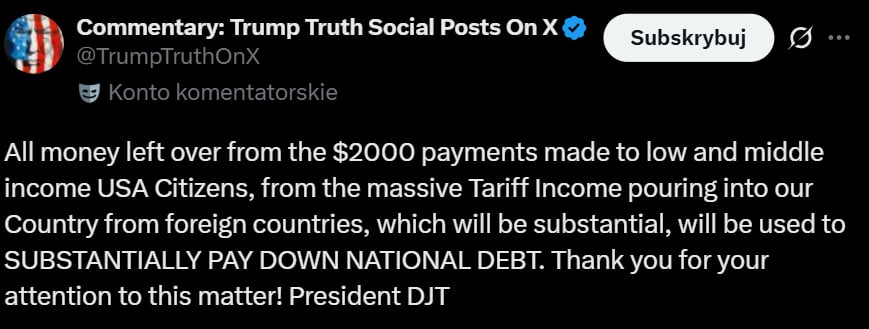Pomysł, który Trump rozwija od miesięcy, wciąż pozostaje w sferze deklaracji, ale tym razem brzmi bardziej jak element realnego planu niż jedynie hasło wyborcze. „Wszelkie nadwyżki z wypłat 2 tys. dolarów dla obywateli o niskich i średnich dochodach zostaną przeznaczone na spłatę długu publicznego. Będzie to kwota znacząca” – napisał prezydent na Truth Social, w swoim charakterystycznym stylu kończąc wpis słowami „Thank you for your attention to this matter!”.