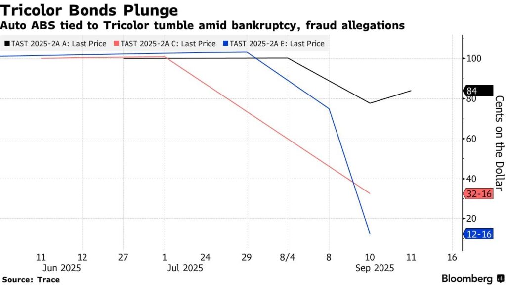 Na razie liczby są bezlitosne. Fifth Third rezerwuje do 200 mln dolarów strat, JPMorgan, a nawet Barclays również szykują się na potężne odpisy. Wartość obligacji zabezpieczonych aktywami Tricolor – jeszcze w czerwcu wyemitowanych za 217 mln – w ciągu tygodnia runęła. Dolne transze, które biorą pierwszy cios w przypadku braku płynności, spadły do… 12 centów za dolara. To nie jest korekta, ale rzeź.