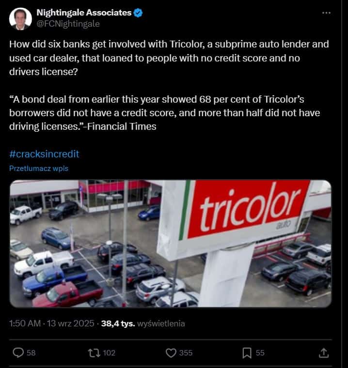 Kiedy w 2008 roku wysypywały się tzw. mortgage-backed securities, mówiono: „to lekcja na pokolenia”. Tymczasem historia się powtarza, tylko w innym segmencie rynku. Subprime auto lenders padają jeden po drugim – American Car Center, US Auto Sales, a teraz Tricolor. Schemat jest podobny: agresywna ekspansja, wysokie oprocentowania, klienci na marginesie systemu … A gdy gospodarka zwalnia – karty domino lecą.