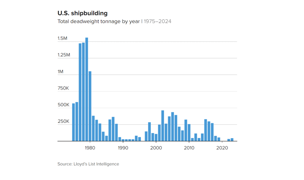 Wszystko to w oczywisty sposób stanowić będzie radykalną rewolucję w odniesieniu do modelu logistycznego transportowanych do USA towarów. Kraj ten, jeden z największych importerów świata, uczyni bowiem efektywnie nieopłacalnym transport wykorzystujący chińskie statki. Zabieg ten jest celowy – stanowić ma bowiem ekonomiczną zachętę do odnowy produkcji stoczniowej w USA. Ta bowiem w ostatnich dekadach ostro i radykalnie się skurczyła. I dziś amerykańskie stocznie praktycznie nie stanowią poważnego gracza na rynku jednostek handlowych.