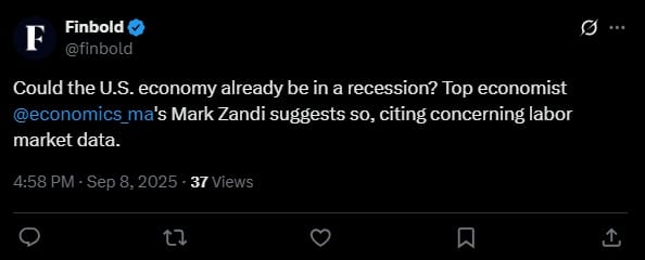 Mark Zandi, główny ekonomista Moody`s Analytics, wskazał na kilka statystyk, które sugerują, że recesja w USA już występuje. Ekspert wskazał między innymi na anomalie na amerykańskim rynku pracy. Zandi dostrzegł, że sektor zatrudnienia jest mocno uzależniony od dwóch branż — opieki zdrowotnej oraz hotelarstwa.