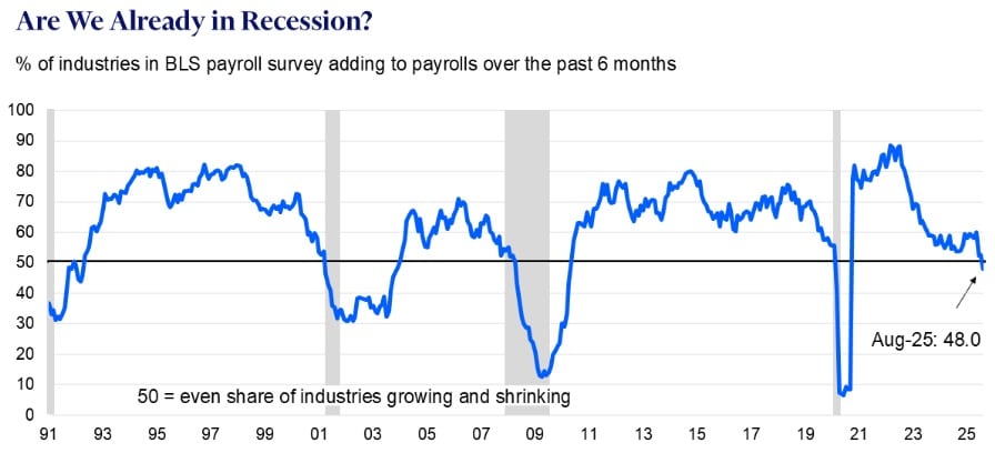Analityk ustalił, że gdyby nie te dwa sektory, to zatrudnienie w USA od początku 2025 roku zostałoby praktycznie na niezmienionym poziomie. Według najnowszych danych za sierpień zaledwie 48% branż utworzyło nowe miejsca pracy, co stanowi spadek poniżej neutralnej linii 50%.