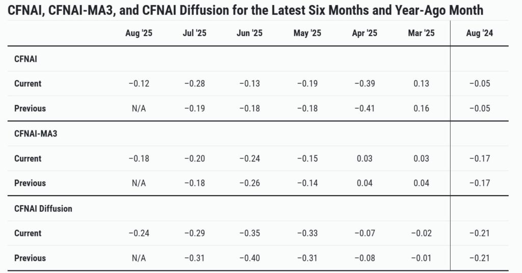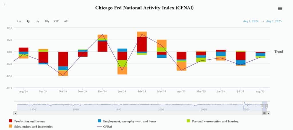 Sierpniowy odczyt Chicago Fed National Activity Index (CFNAI) zaskoczył lekką poprawą – z lipcowych –0,28 do –0,12. Co prawda to wciąż wynik ujemny, czyli gospodarka rozwija się poniżej swojego długoterminowego potencjału… Ale dynamika nieco wyhamowała spadki. Co ciekawe, trzy z czterech głównych grup wskaźników pokazały poprawę względem lipca. Jednak same kontrybucje nadal pozostawały ujemne.