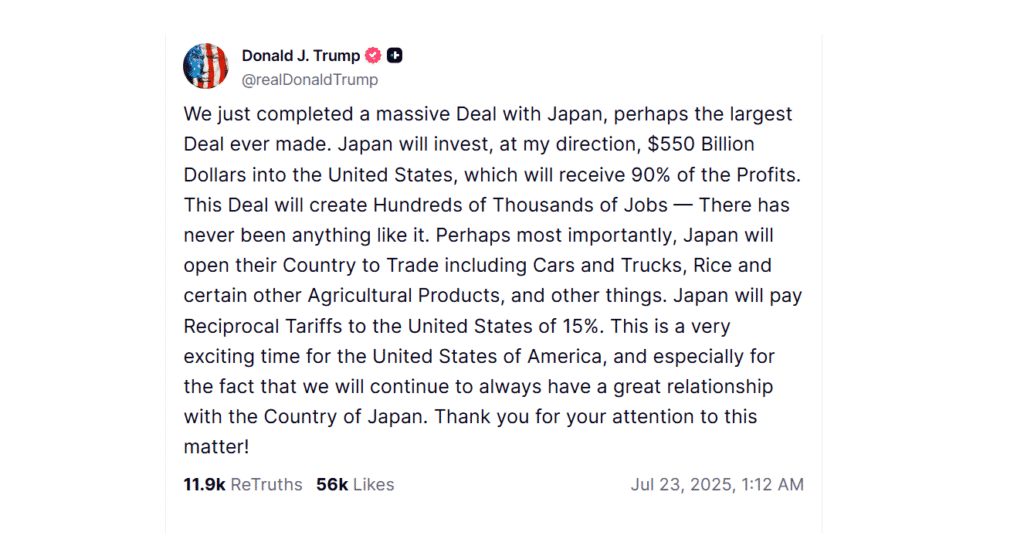 O zawarciu porozumienia poinformował osobiście Trump, w ulubiony dla siebie sposób – czyli za pośrednictwem wpisu na portalu TruthSocial. Umowa uwzględniać ma cło na towary, które Japonia i jej eksporterzy wysyłają do Ameryki, w wysokości 15%. Zawiera także szereg innych zobowiązań. By oddać głos amerykańskiemu prezydentowi: