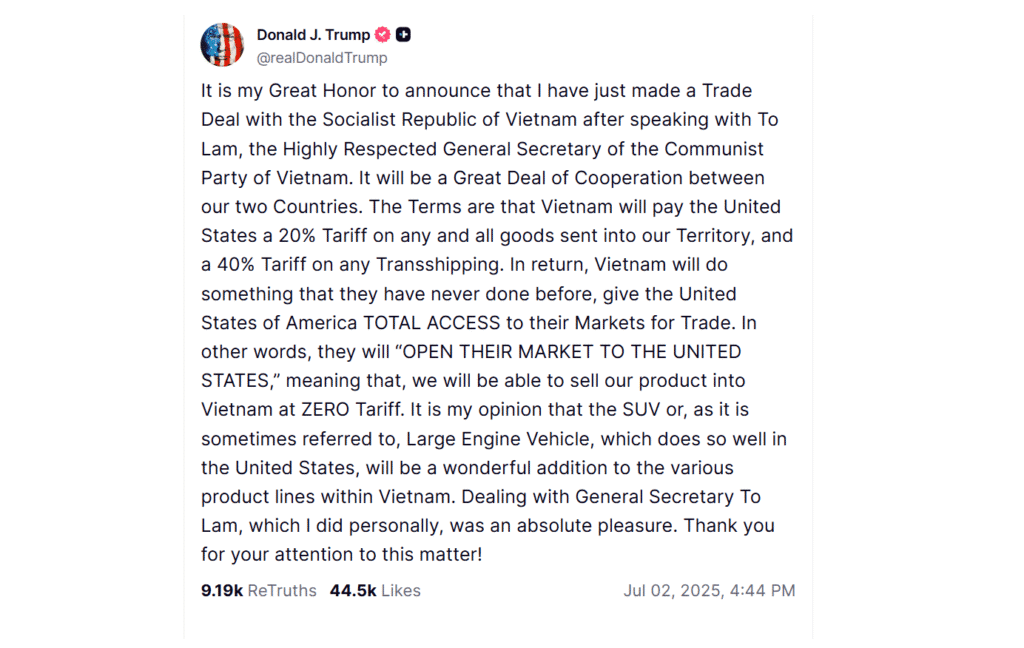 Wieści o porozumieniu, jakie Socjalistyczna Republika Wietnamu (jak brzmi oficjalna nazwa tego państwa – i bynajmniej nie bezzasadnie, biorąc pod uwagę jego realia wewnętrzne) zawarła ze Stanami Zjednoczonymi Ameryki, pochodziły nie od kogo innego jak Donalda Trumpa we własnej osobie. Rzeczony ogłosił je w długim wpisie na swoim ulubionym medium społecznościowym, portalu TruthSocial.